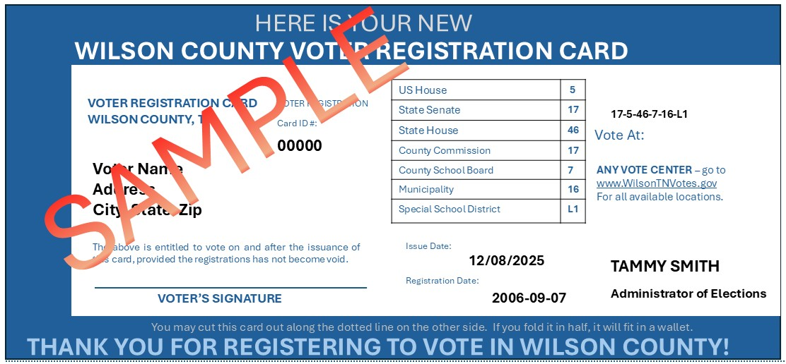 “We encourage voters to inspect their card carefully and contact the Wilson County Election Commission with questions or concerns”, said Tammy Smith, Wilson County Administrator of Elections.
